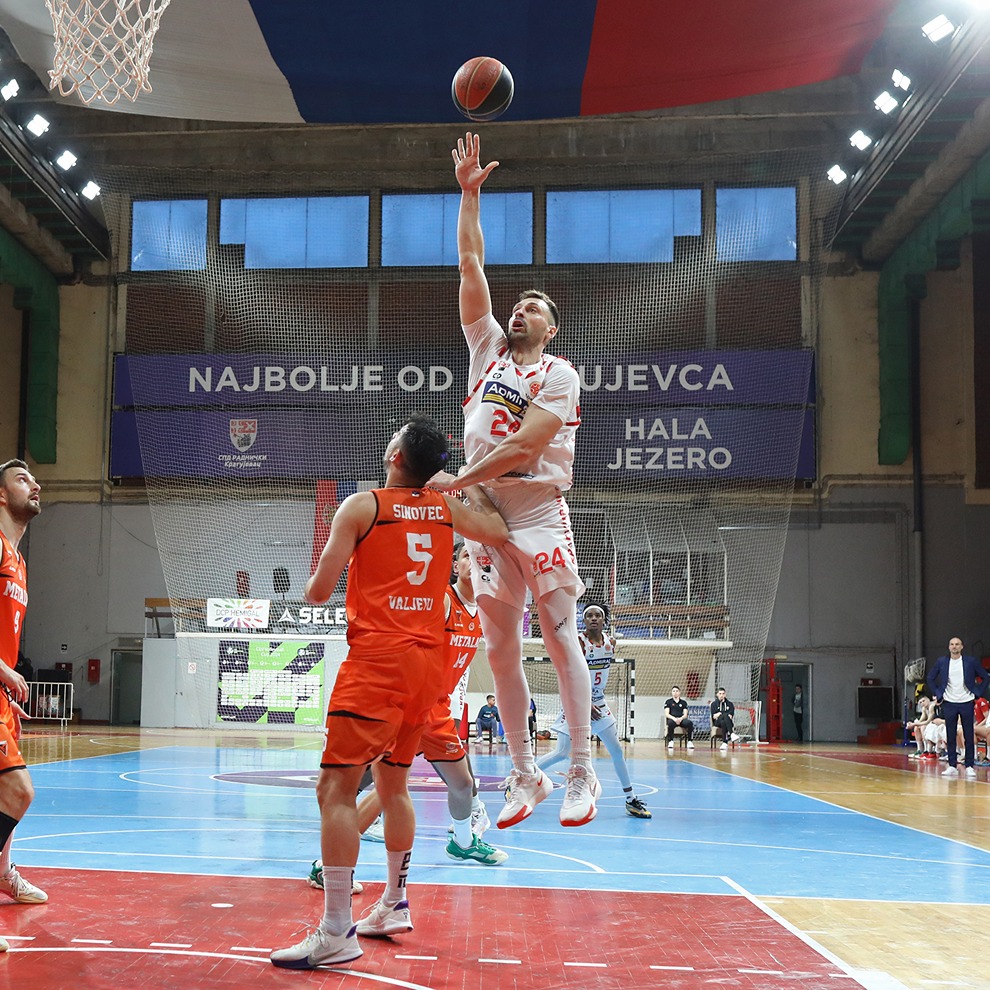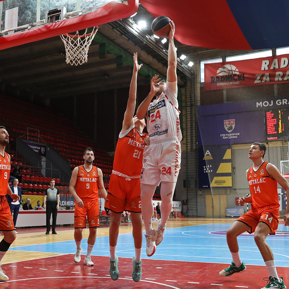 Odlična napadačka predstava Kragujevčana i zaslužena pobeda nad Metalcem iz Valjeva. Nije delovalo u prvih par minuta da će Crveni upisati važnu pobedu kako bi ostali u igri za mestom koje vodi u Super ligu. Gosti su sjajno otvorili meč i već u 4. minutu stekli 10 poena prednosti (3:13). Nakon tajm auta trenera Simonovića, budi se kragujevačka ekipa i stiže do izjednačenja koje ostaje na snazi do kraja prvog dela igre. Milosavljević, Webster i Croft počinju da „terorišu“ goste iza linije 6.75 i vrlo brzo dolazi do potpunog preokreta u kojem Crveni dolaze do prve dvocifrene prednosti (38:28). Stečenu prednost nisu ispustili do poluvremena, a na veliki odmor odlaze sa +12 (53:41).